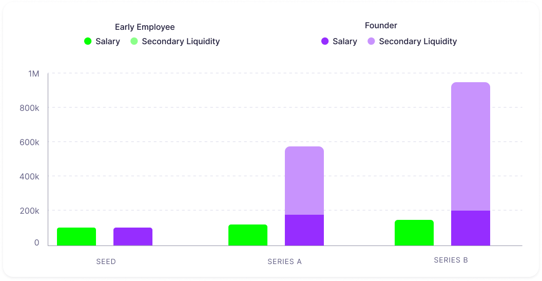 The founder in this scenario was offered $400,000 of liquidity at Series A and $750,000 at Series B and encouraged to do so by their board of investors to de-risk their own life. Liquidity was not offered to any employees and the fact that this happened at all was only revealed to people on the cap table.